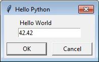 result = simpledialog.askfloat( "Hello Python", "Hello World", initialvalue=42, minvalue=1, maxvalue=99)