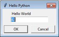 result = simpledialog.askinteger( "Hello Python", "Hello World", initialvalue=42, minvalue=1, maxvalue=99)