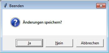 result = messagebox.askyesnocancel( "Beenden", "Änderungen speichern?") if result == True: __messagebox.showinfo("Beenden","Save") elif result == False: __messagebox.showinfo("Beenden","No Save") elif result == None: __messagebox.showinfo("Beenden","No Close") else: __messagebox.showinfo("Beenden","Fehlerhafte Abfrage")Folgende Symbole sind möglich: