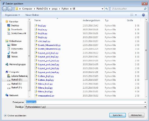 filename = filedialog.asksaveasfilename(initialfile="Beispiel.py", title="Dateien speichern", initialdir="D:\\progs\\Python\\UI\\", filetypes=( ("Pythondateien",".py" ) ,("Alle Dateien","*.*" ) ) ) if filename: __messagebox.showinfo("Auswahl",filename) else: __messagebox.showinfo("Auswahl","Abbruch")