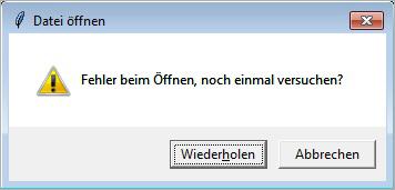 result = messagebox.askretrycancel( "Datei öffnen", "Fehler beim Öffnen, noch einmal versuchen?")