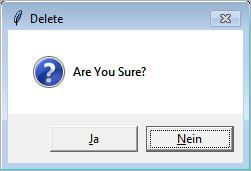 # error warning info question default='yes' result = messagebox.askyesno("Delete", "Are You Sure?", icon='question', default='no') if result == True: __messagebox.showinfo("Deleted","Deleted") else: __messagebox.showinfo("Not Deleted","Not Deleted")Folgende Symbole sind möglich: